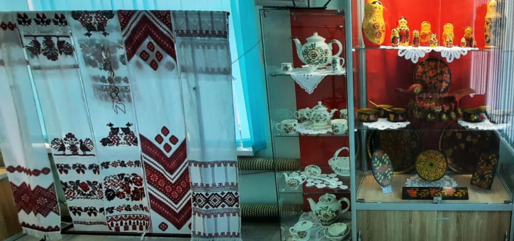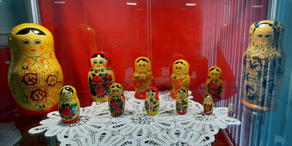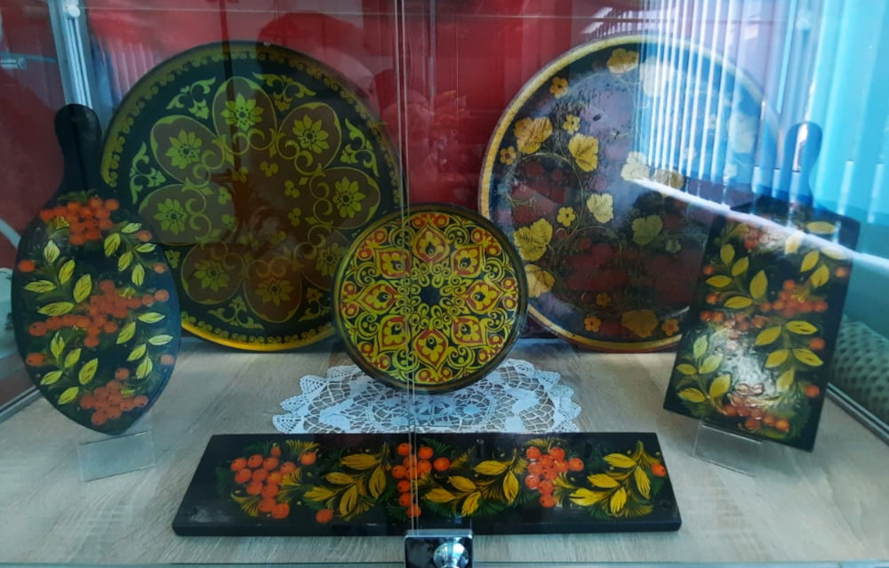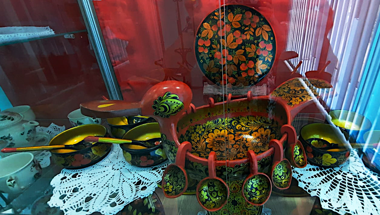 Музей также предлагает посетителям ознакомиться с выставкой изделий, изготовленных из дерева с хохломской росписью. Это различная деревянная посуда: подносы, тарелки, ложки, а также коллекция матрешек различной величины.