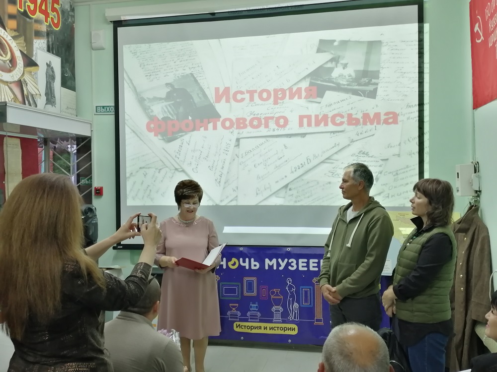 Вечер продолжился историей фронтового письма, которую подготовила научный сотрудник музея Любовь Николаевна Катрушина, а затем артистка театра и кино Евгения Павлова прочла письмо солдата, тронувшее присутствующих до глубины души.